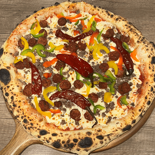 Base tomate, mozzarella, viande hachée, merguez, poivrons, piments.