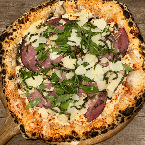 Base tomate, mozzarella, roquette, champignons frais, bœuf fumé, crème de basilic, parmesan.
