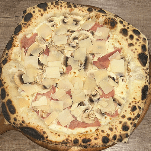 Base crème, mozzarella, jambon supérieur, champignons frais, parmesan.